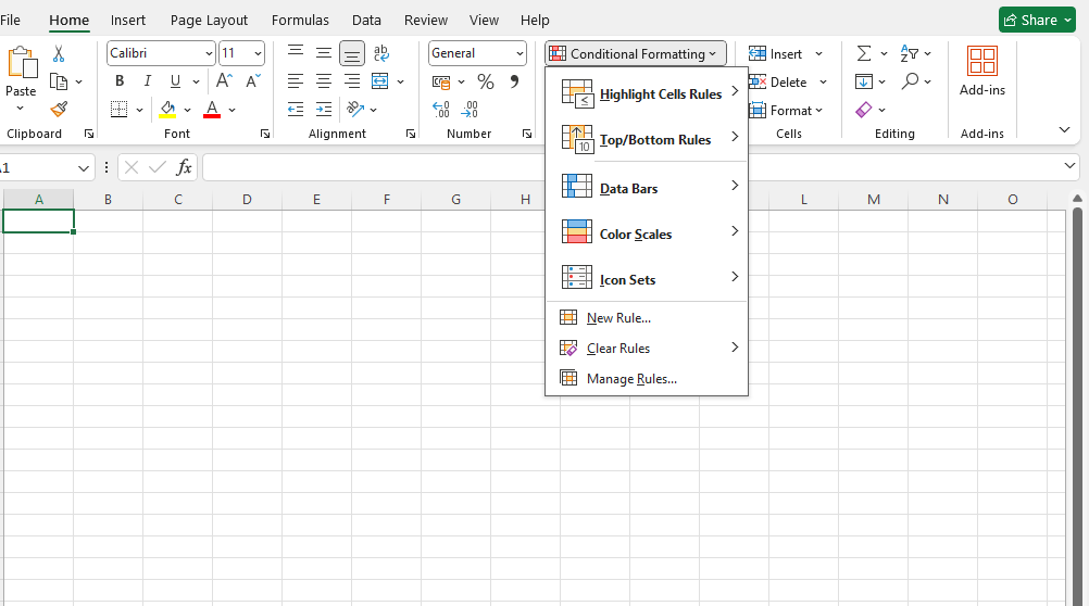 2.Click on the Conditional Formatting icon  in the ribbon, from the Home menu.