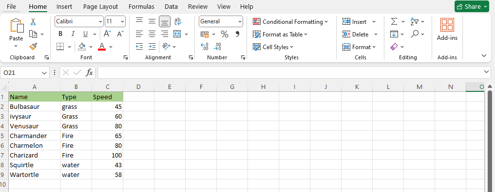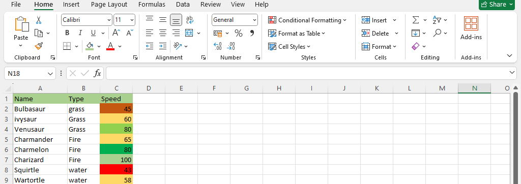 Highlight the Speed values of each Pokémon with Colour scale conditional formatting.