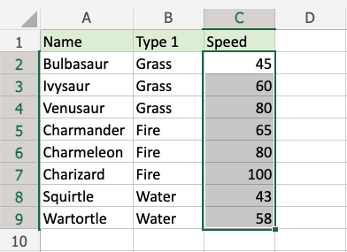 1.Select the range of Speed values C2:C9