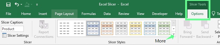 Click on your slicer to bring up the Slicer Tools tab. Under this tab, go to the Options section and check out the Slicer Styles group. Here, you’ll see several built-in styles — pick one you like.