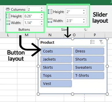 I also adjust the button sizes to make everything look balanced. To do so, go to the Slicer Tools Options tab, tweak the height and width settings, or drag the edges of the slicer until they look right. However, I’d recommend keeping the slicer buttons large enough to be easy to click but not so big that they take over the whole sheet.