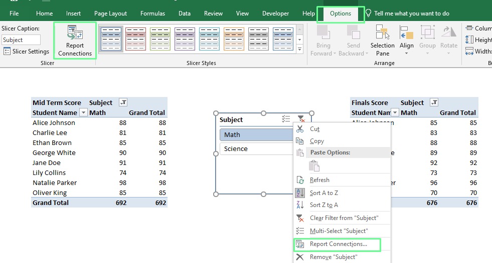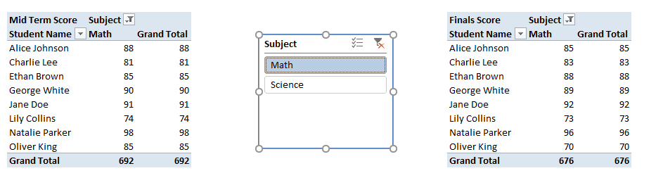 Now, I can filter this data with a single click to see the students’ midterm and final scores. It saves so much time and makes analysing multiple PivotTables easy. Making a connection this way also helps avoid unforced errors.