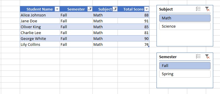 Using slicers: I’d insert slicers for Semester and Subject and place them right next to my table. With just two clicks, I can visually filter the data. The slicers also make it easier for others to interact with the report without extra instructions.