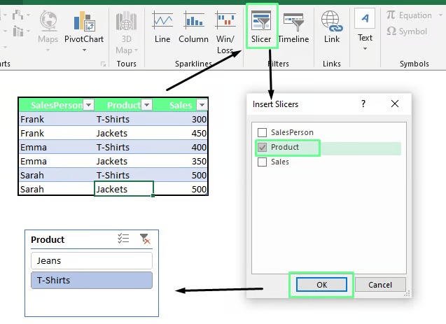 2. Go to the Insert tab, find the Filters group, and click Slicer.